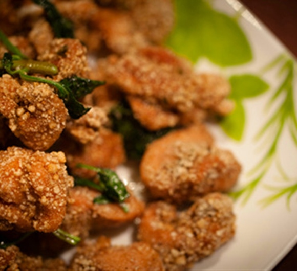 ④最后往锅中再放入九层塔,与盐酥鸡一起炸出香味,即可起锅。