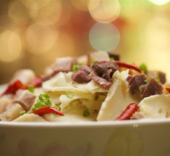 ③冬笋和火腿焯制完成之后,用葱花爆锅,待到煸出香味之后将这二位主角入锅煸炒。金黄的冬笋和火腿,加上火红的辣椒,颜色非常好看。用大火