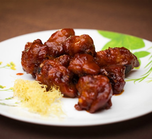 ④在锅里铺一点底油,将剩下的大蒜煸至金黄色,直接淋到炸好的排骨上,浇的时候还能听到滋滋的声音。至此,这道黄金灿灿的黄金京都排骨就