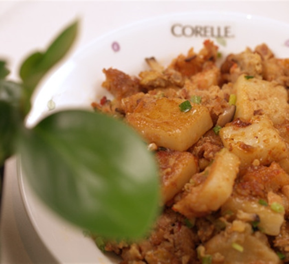 ④锅中放油,将萝卜糕依次放入锅内煎成两面金黄,表皮发脆。这时可以直接往锅中加入大蒜、虾仁、萝卜干、火腿和菠菜进行最后