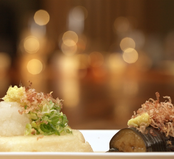 ⑤锅中下油,待温度升高后,将切好的茄子和豆腐下锅炸制。茄子一定要沿着油的表面慢慢地滑入油中,避免油花飞溅。油温高的话可以让茄子加速变熟,减少茄子的吸油量,这就是炸茄子不油腻的秘诀。炸好的茄子是没有味道的,所以需要蘸料。茄子炸好之后,需要把表面的油沥干,这样也有利于稍后的调料入味。