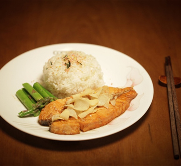 杏鲍菇、蟹味菇、洋葱、三文鱼、米饭、脱盐黄油、