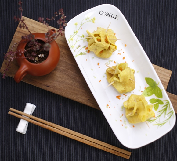 ⑤将蛋皮切成5平方厘米大小的正方形,放入馅料后包起来,以牙签固定。