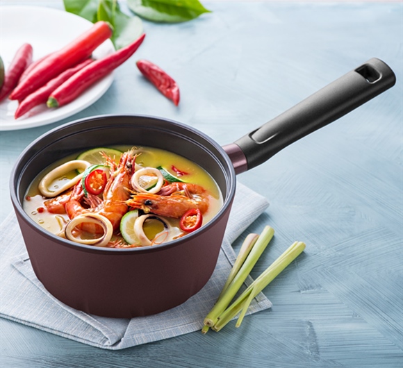 2.单柄汤锅空锅烧至五成热,倒入橄榄油,下蒜末、姜蓉、柠檬叶煸炒出香,放入咖喱粉、小红辣椒圈搅拌一下后注入蔬菜汤煮开。