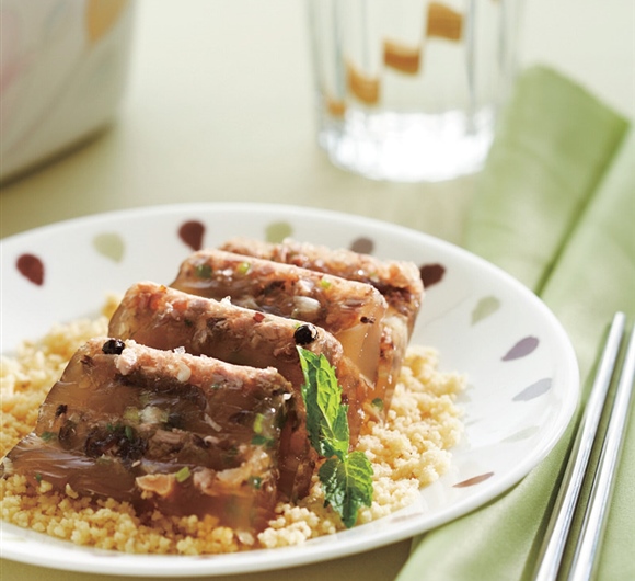 3 另取一支康宁锅,倒入部分高汤,待高汤凝固时放人参片,再倒入一些高汤,稍微凝固时,撒上松子粉、蛋白丝、蛋黄丝、石耳丝后再倒一层高汤并盖过食材。放入冰箱待完全凝固后,倒出切成薄片装盘即可。