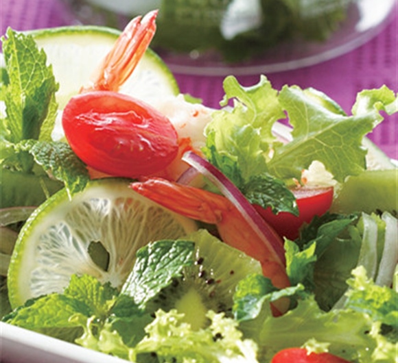 2 奇异果切成适当宽度的片,小西红柿对半切开,狼牙生菜撕开,一半柠檬切片。调味酱汁先做好:挤出另一半柠檬汁当底,加入白糖、鱼露(一点就好,以免太腥、太咸),接着放入甜辣酱,扮匀,糖一定要全部融解。