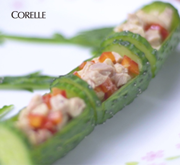 5. 将搅拌均匀的鸡肉丁和红椒丁塞入黄瓜竹筒里,摆盘装饰。