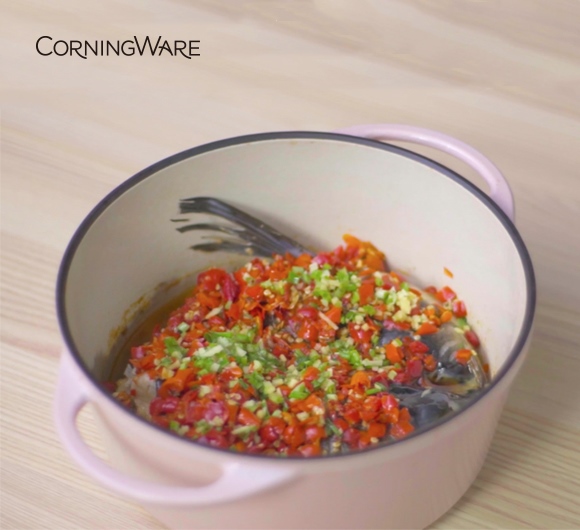 2. 康宁铸铁锅锅底刷油,把姜丝和葱段均匀铺满锅底。