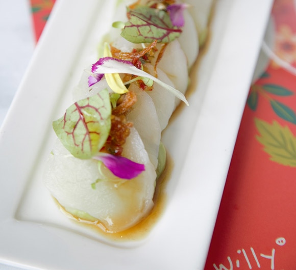 将扇贝洗净并切下扇贝肉。在餐盘的中央,铺上牛油果慕斯,然后再放上10块扇贝肉,铺满盘子。将蚝油在扇贝肉上淋成一条直线。撒上少许香葱和芥菜。用适量的海盐和黑胡椒调味。最后用可食用花朵进行点缀,然后淋上橄榄油。