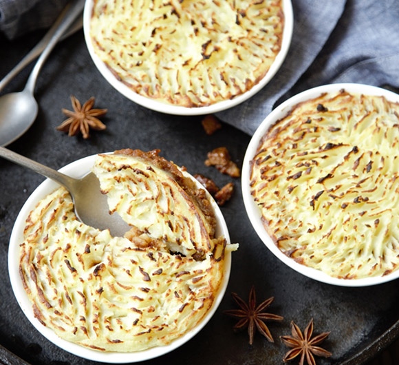 使用裱花袋或者保鲜袋将土豆泥挤到酱上。一旦覆盖后,用一个叉子在上面画几条线 - 这些之后都会变脆。 将烤盘放在靠近热源的架子上,直到顶部烤成金黄酥脆。