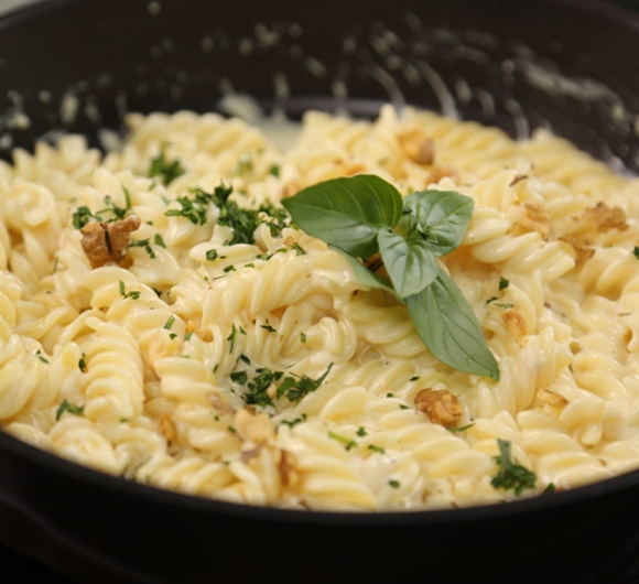 250ml全脂奶油、芝士碎(3种):帕尔马干酪、切达干酪、瑞士干酪、盐和胡椒、切碎的核桃仁、二分之一杯切碎的欧芹;