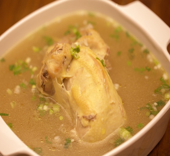 ①首先熬制鸡汤。选取鸡爪和鸡头来熬汤,同时加入三头大蒜、胡椒粒、大葱、青蛤。用青蛤来提升汤的鲜味,倒入清水,锅开之后小火慢炖40分钟。