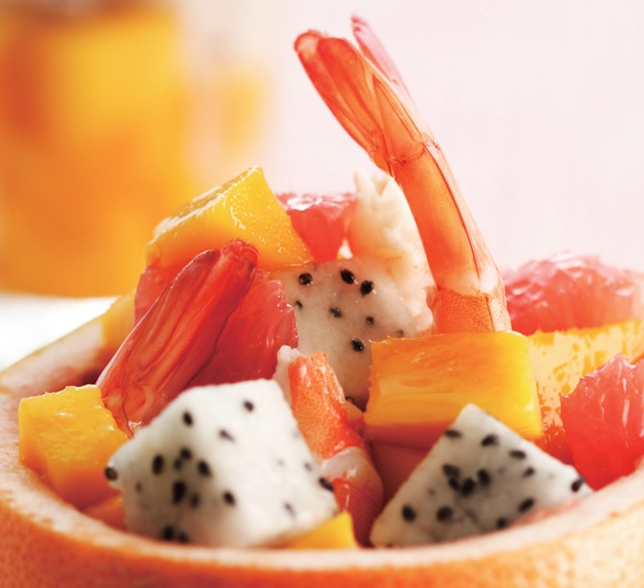 3 火龙果、芒果在康宁餐盘中均匀切成小块,挖去果肉的西柚处理成小碗状,取出所有加工好的原料,将火龙果、芒果放入西柚盅,依个人喜好倒入适量酸奶,点缀上鲜虾即成。