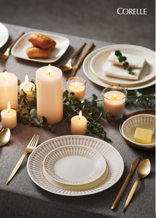 Corelle象牙白系列拥有多种花色,以适应不同的用餐场合,而此次推出的金色年轮花色,一改以花卉图案为主要设计元素的传统,而是运用几何图形与抽象线条来勾勒,耳目一新的图案造型,释放无尽想象空间。美食,美器,再配上当季鲜花,则让餐桌上的浪漫氛围继续升华。
