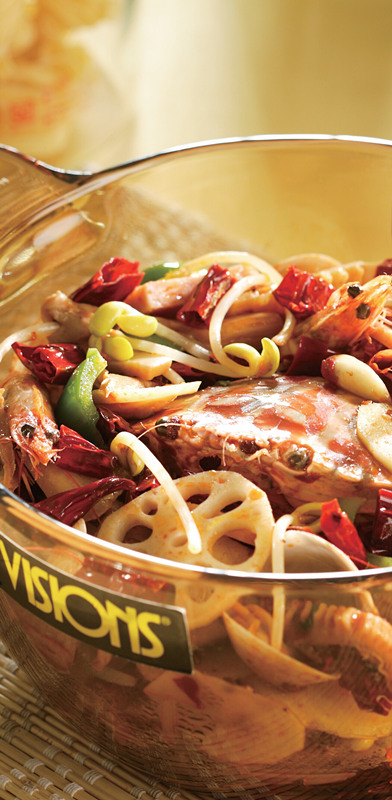 3 炒:锅中入油,烧至七成热,下入大量干辣椒和花椒粒,辣椒变紫后,再下入葱、姜、蒜,爆香。放入麻辣烫调料、郫县豆瓣酱、老干妈牛肉辣酱,熬开麻辣烫调料后,将鲜虾放入煸炒,待虾完全变红后,将焯好的藕、竹笋、土豆、平菇、红黄绿椒、豆芽和豆干、午餐肉一起下锅,并放入啤酒、盐、白糖、鸡精,继续翻炒。等菜都炒熟了、颜色均匀了,再放入醋和香油,翻炒几下直接端上餐桌,一道香喷喷、热腾腾的麻辣香锅就做好了。