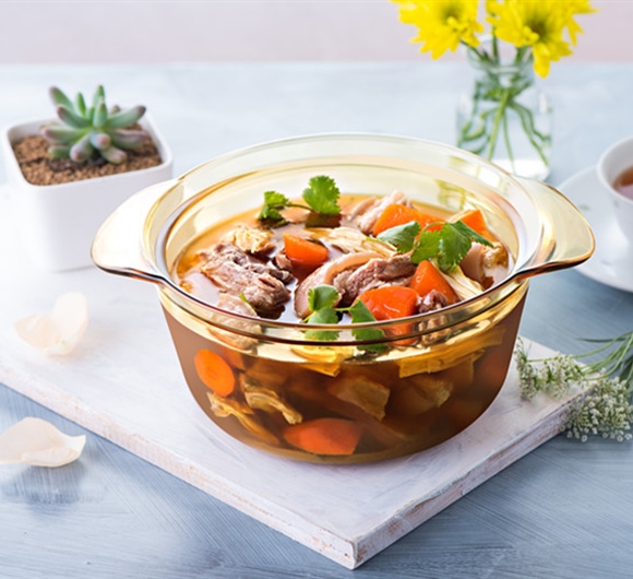 3.加入候柱酱、生抽后,加入适量的开水没过羊肉,用小火炖煮30分钟。揭盖放入冬菇再煮30分钟后,加入枝竹继续炖煮30分钟。上桌前,撒上香菜碎即可。