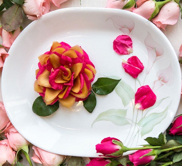 4.一层玫瑰一片萝卜重叠起来装盘,成品看似一朵盛开的玫瑰。
