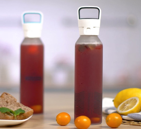 4:将过滤后的洛神梅汁倒入康宁X杯内,两颗金桔切片后同薄荷叶一起放入。