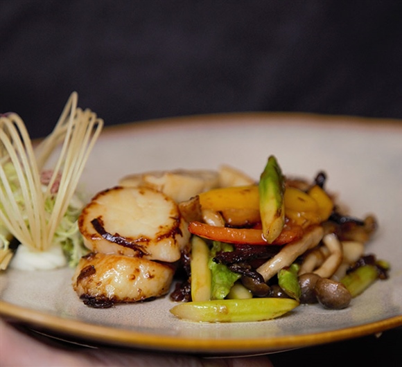 起锅放少许油,将油鸡枞煸香后放入芦笋、百合、蟹味菇与带子,放少许