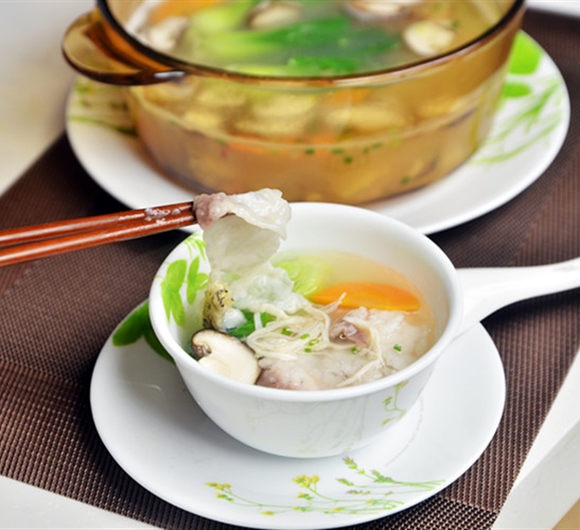 4. 加热锅中的鸡汤,下入香菇丝、胡萝卜丝煮开,放入鱼片、鸡丝、菜心、料酒煮1分钟,关火,淋上少许芝麻香油即可。