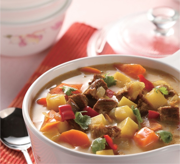 4 煮开后小火慢炖1.5-2 小时,其间要搅拌材料,以免底部黏锅。等水差不多收干时,加入红椒块、香菜即可上桌享用。