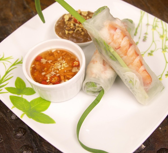 ④现在正式开始制作虾卷。米皮是越南每个家庭餐桌上必备的食材,现在在国内也很容易买到。首先把米皮用热水稍稍浸泡一下。将它放在案板上,记住,案板不能太干燥,否则它会黏在案板上,当然也不能太潮湿,不然米皮会变得太软。米皮变成透明之后顺序放入虎虾、生菜、猪肉、黄瓜、粉丝、薄荷叶、青紫苏叶和小葱。最后用米皮包裹住,慢慢收边卷起就可以了。卷的时候最好卷得紧实一些。