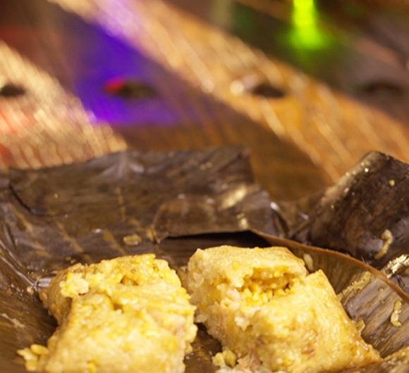 ③将粽子包成方形可是个技术活儿,先将肉馅包到绿豆里,再一起放在糯米里,盖上芭蕉叶就可以了。包法其实有点儿像我们吃烤鸭时,先折一下,再折一下就行了。