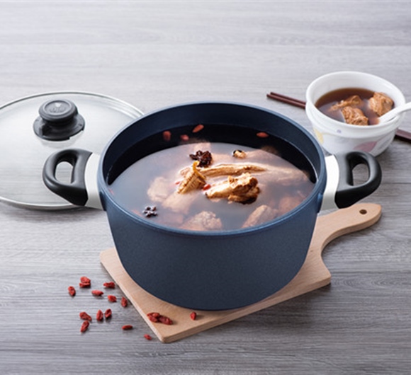 4.把上一步调的汁加入锅中,放入枸杞,盖上锅盖并闭住,康宁蓝宝石系列锅特有的提手上的透气孔,保证密闭效果,中小火煮酥,最后根据自己口味加入胡椒粉和盐,即可出锅