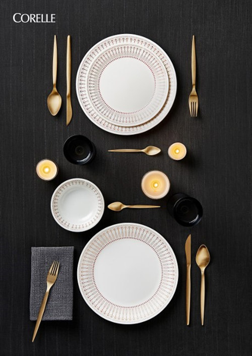 代表着纽约大都会前沿风尚的Corelle象牙白系列,也时刻诠释着迷人格调和时尚气息。低调优雅的香槟金色,混合柔情珊瑚红,搭配象牙色的白胚,在相互映衬下,更显时尚雅致。且每一件餐具底部都有其独特的金色身份标识。