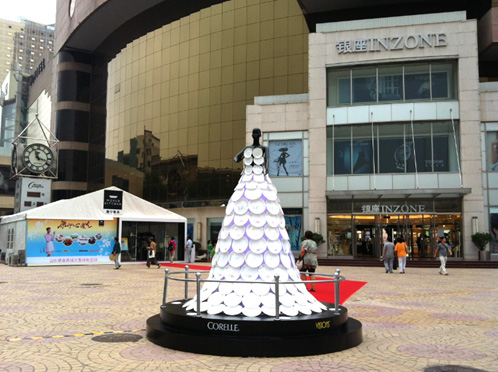 美国康宁餐具于2012年将法兰克福展会的Corelle新娘搬到了济南银座户外活动现场,Corelle餐具拼成的美丽”婚纱”披在了2.8m的新娘模特的身上,现场路过的每一位人士无不瞠目结舌,匆忙掏出手机相机拍照,更加吸引附近购物经过的各国外籍友人现场与这位”美丽新娘”进行合影。
