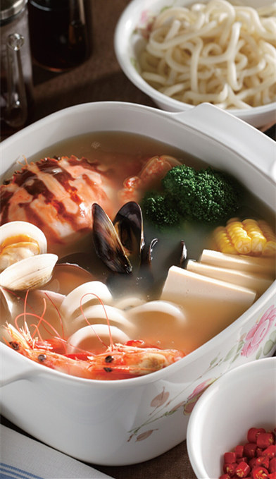 2 待已有的食材煮沸后,加入基围虾、文蛤、海虹、豆腐、乌冬面等其他食材,并用小火慢煮。